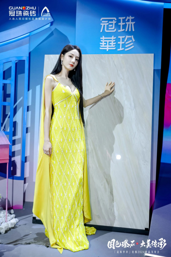 冠珠瓷磚品牌代言人迪麗熱巴身穿金黃色典雅高定禮服亮相活動現(xiàn)場,內(nèi)斂高貴,美艷動人。在探店上海冠珠旗艦總店的過程中,其優(yōu)雅奢華的形象與冠珠華珍大美國色大美同框,相偕相融。